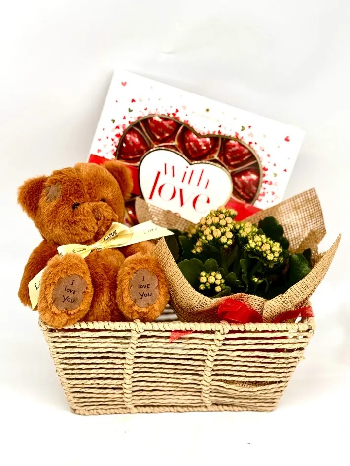 עציץ ניצנית בלי יוטה דובי פרווה 20סמ מארז שוקולד בתוך סלסלה מעוצבת